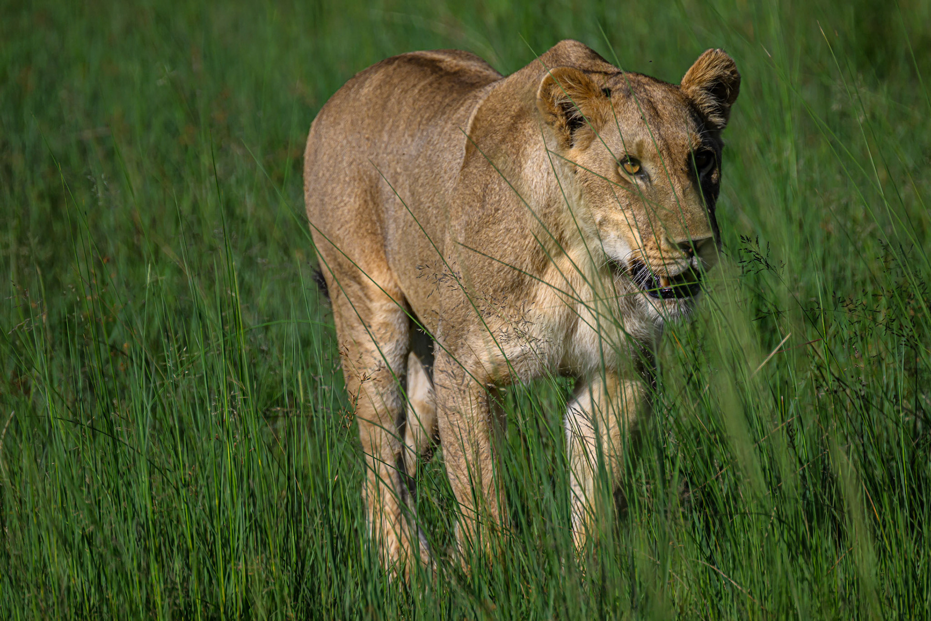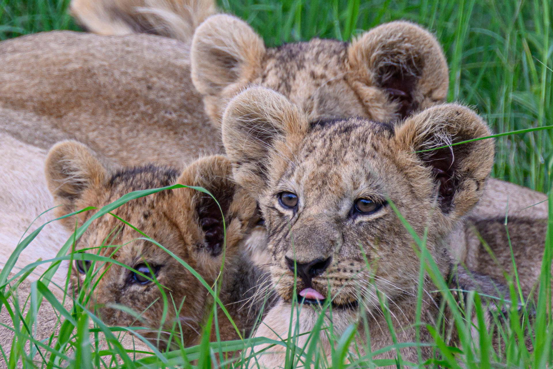We found two lionesses - one with 4 cubs, the other in support - who had (very wisely) distanced themselves from the main pack, so that they could nurture the cubs in safety without the dominant pack males interfering and trying to kill their offspring. Talk about photogenic - it was hard not to stay all day. Then one of the adults spotted some Impala and tried to get within striking range, but some larger juvniles arrived to play - and the hunt was forgotten.